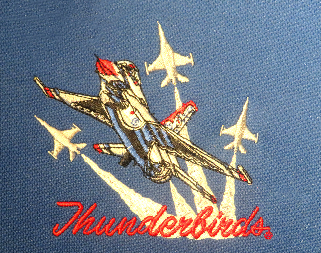 Look sharp wearing this Royal Blue Devon & Jones Pima Pique Short Sleeve Embroidered Polo! The Left Chest Decoration, approximately 4" x 4" in size depicts the famous Thunderbirds Diamond Break, close up detail highlights the #4, F-16C jet, as it breaks away from the others.